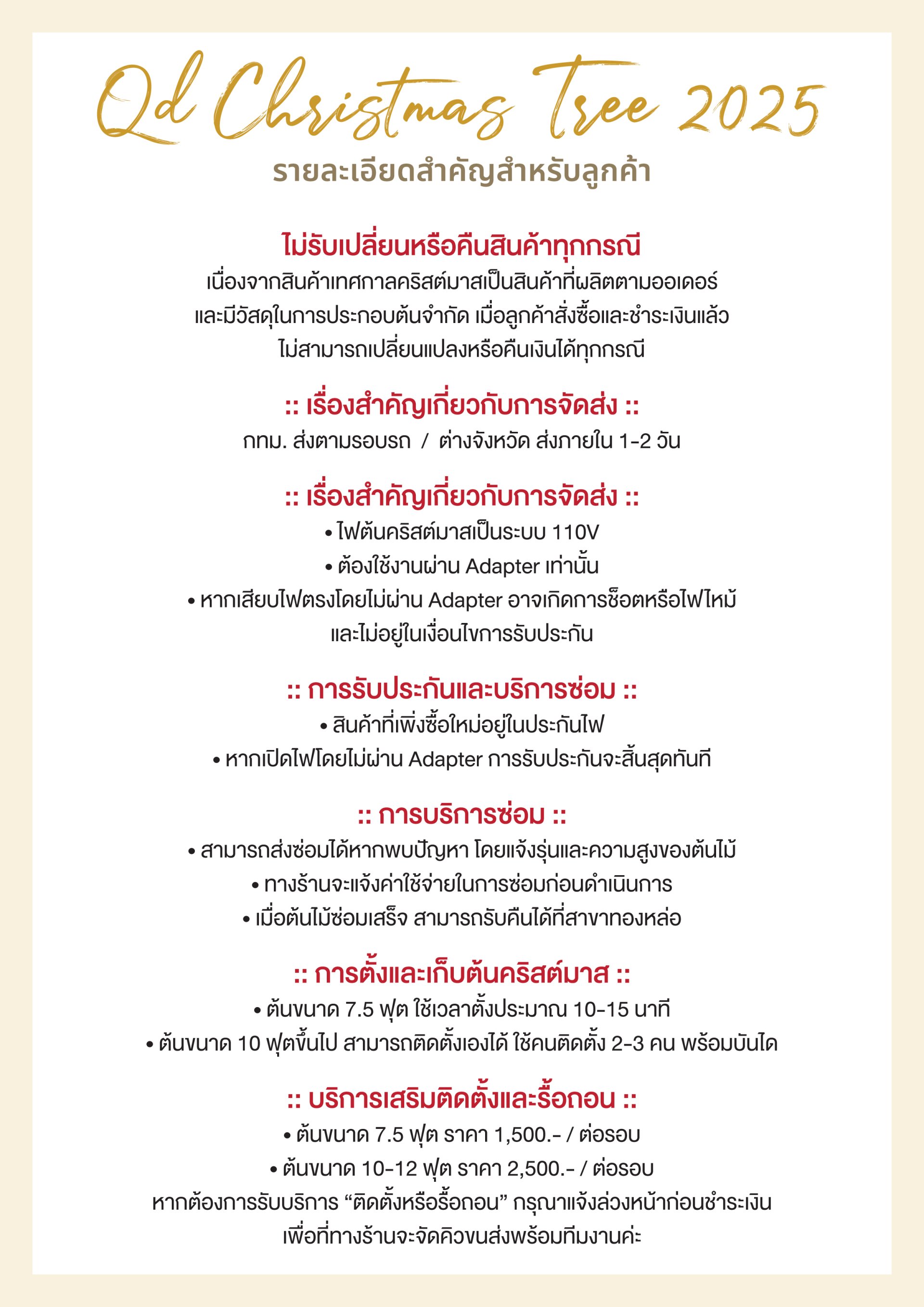 หมายเหตุ : ต้นทุกต้น Pre-lit มีไฟในตัว / หากต้องการความสูงเกิน 12 ฟุต สั่งทำได้